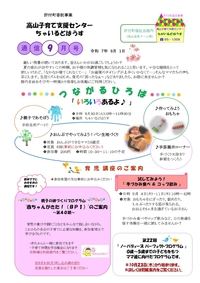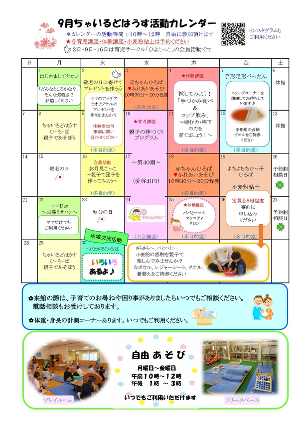 ちゃいるどはうす通信9月号掲載 2025.08.19 ちゃいるどはうす通信9月号をお知らせします。カレンダーのメニューに限らず、「館内自由あそび」や「妊娠期から子育て期の相談窓口」もご利用できます。パパやマタニティママのご利用もお待ちしています。お気軽にご利用ください。 < 中止のお知らせお知らせ >