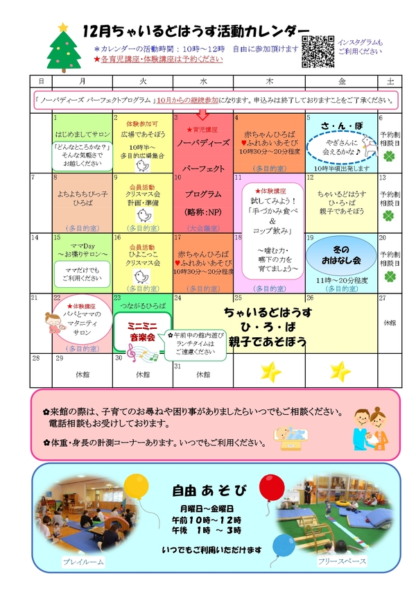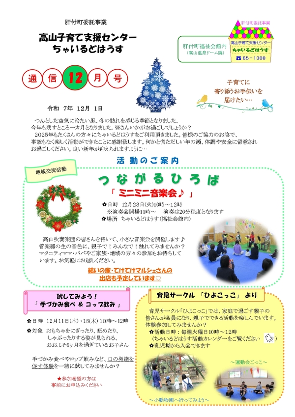 ちゃいるどはうす通信12月号掲載 2025.11.19 ちゃいるどはうす通信12月号をお知らせします。カレンダーのメニューに限らず、「館内自由あそび」や「妊娠期から子育て期の相談窓口」もご利用できます。パパやマタニティママのご利用もお待ちしています。お気軽にご利用ください。 < お知らせランチタイムの利用について >