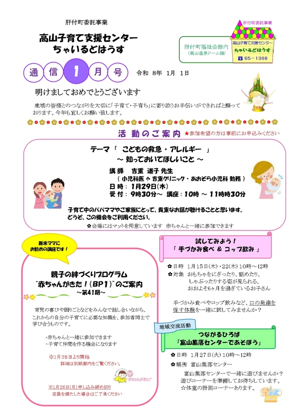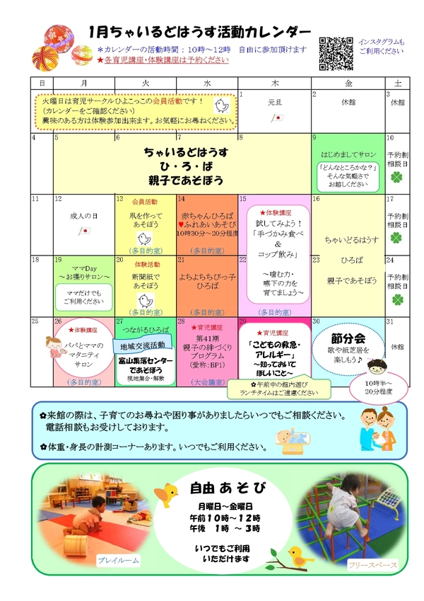 ちゃいるどはうす通信1月号掲載 2025.12.29 ちゃいるどはうす通信1月号をお知らせします。カレンダーのメニューに限らず、「館内自由あそび」や「妊娠期から子育て期の相談窓口」もご利用できます。パパやマタニティママのご利用もお待ちしています。お気軽にご利用ください。 育児講座のご案内 >